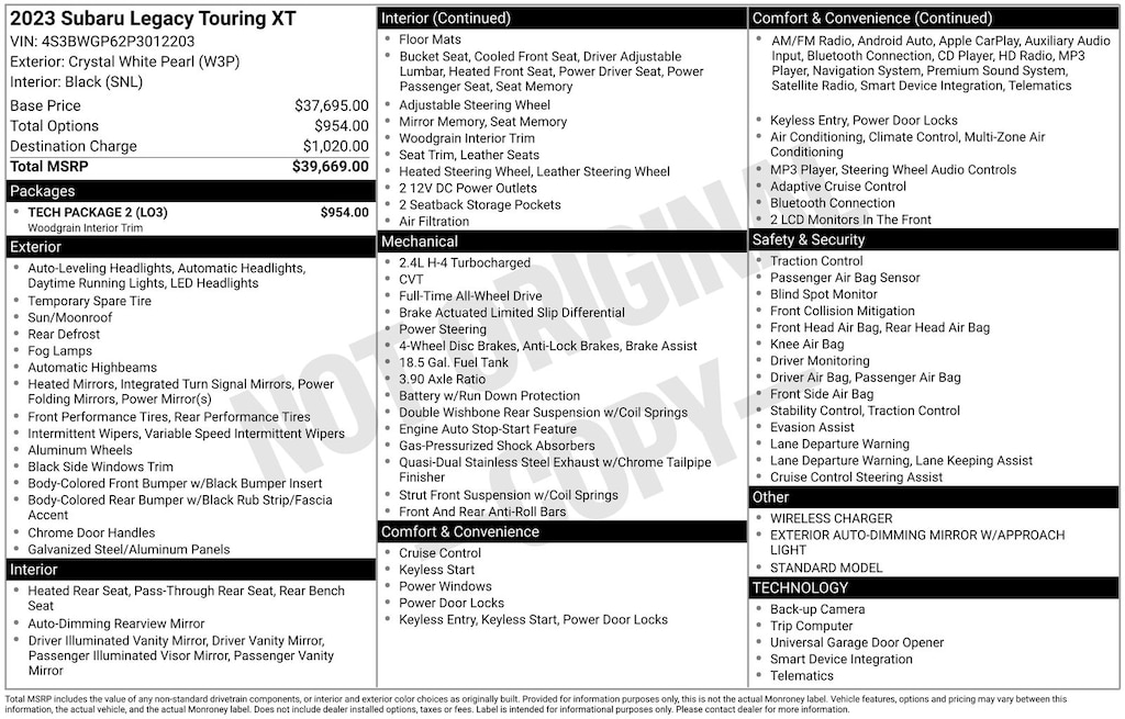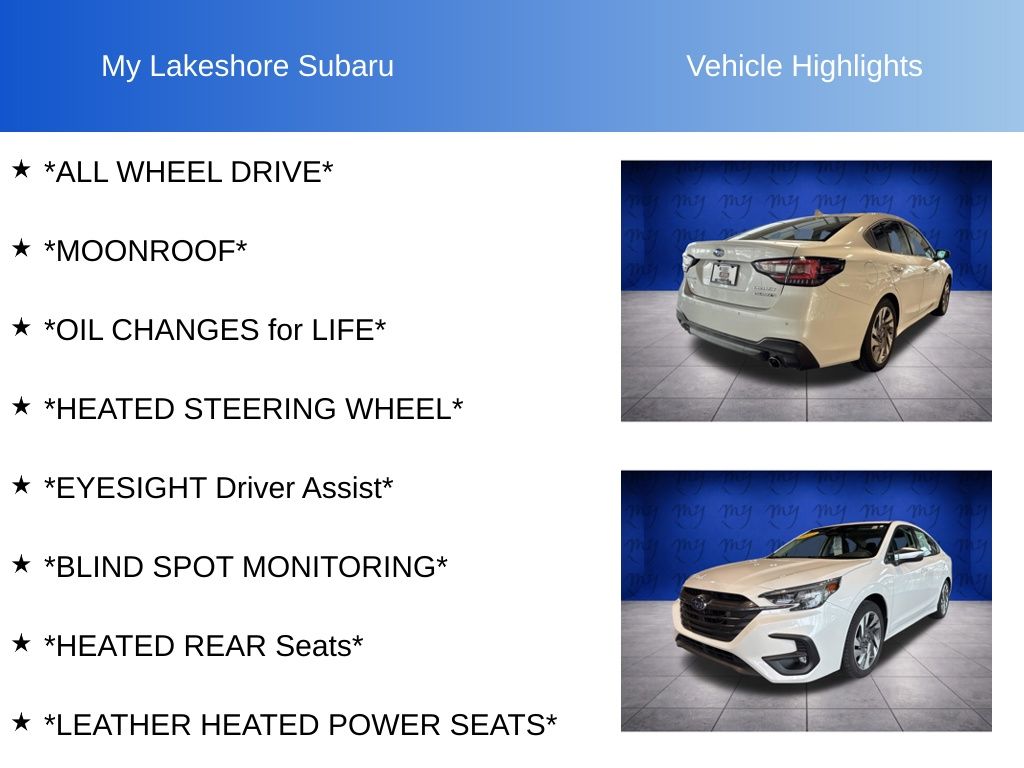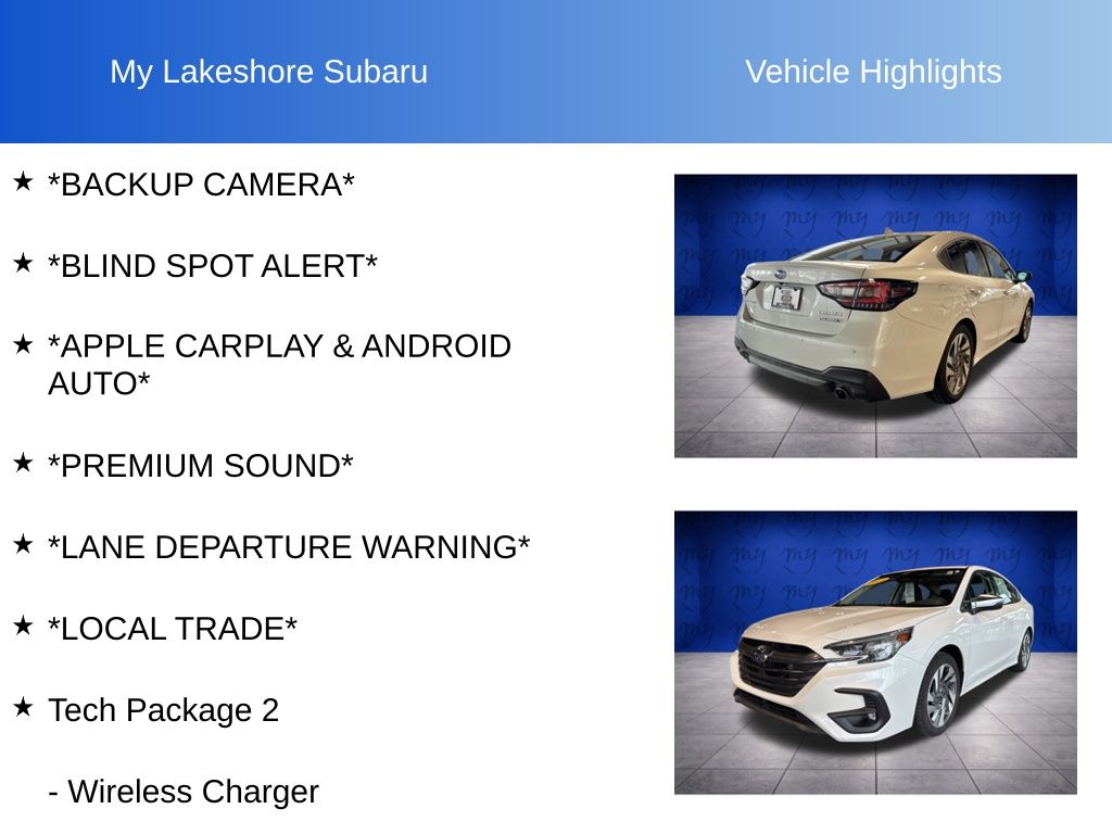 Legacy Touring XT, Crystal White Pearl, *ALL WHEEL DRIVE*, *APPLE CARPLAY & ANDROID AUTO*, *BACKUP CAMERA*, *BLIND SPOT ALERT*, *BLIND SPOT MONITORING*, *EYESIGHT Driver Assist*, *HEATED REAR Seats*, *HEATED STEERING WHEEL*, *LANE DEPARTURE WARNING*, *LEATHER HEATED POWER SEATS*, *LOCAL TRADE*, *MOONROOF*, *OIL CHANGES for LIFE*, *PREMIUM SOUND*, Exterior Auto-Dimming Mirror w/Approach Light, Tech Package 2, Wireless Charger, Woodgrain Interior Trim Kit. Certified. Crystal White Pearl 2023 Subaru Legacy Touring XT AWD Lineartronic CVT 2.4L 4-Cylinder DOHC 16V