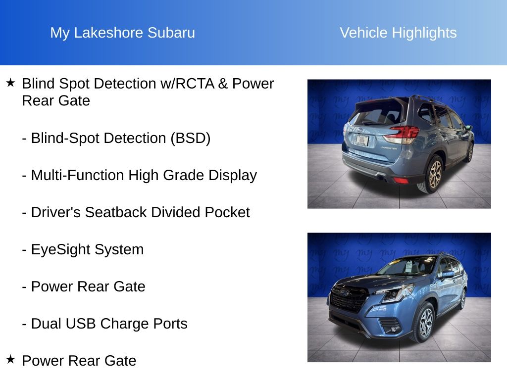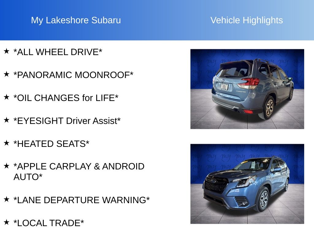 Forester Premium, Horizon Blue Pearl, *ALL WHEEL DRIVE*, *APPLE CARPLAY & ANDROID AUTO*, *EYESIGHT Driver Assist*, *HEATED SEATS*, *LANE DEPARTURE WARNING*, *LOCAL TRADE*, *OIL CHANGES for LIFE*, *PANORAMIC MOONROOF*, Blind Spot Detection w/RCTA & Power Rear Gate, Blind-Spot Detection (BSD), Driver's Seatback Divided Pocket, Dual USB Charge Ports, EyeSight System, Multi-Function High Grade Display, Power Rear Gate. Certified. Horizon Blue Pearl 2024 Subaru Forester Premium AWD Lineartronic CVT 2.5L 4-Cylinder DOHC 16V
