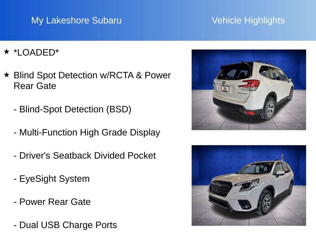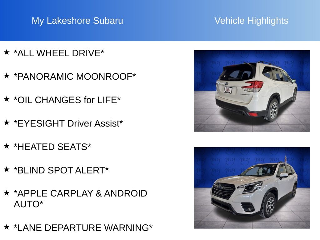 Forester Premium, Crystal White Pearl, *ALL WHEEL DRIVE*, *APPLE CARPLAY & ANDROID AUTO*, *BLIND SPOT ALERT*, *EYESIGHT Driver Assist*, *HEATED SEATS*, *LANE DEPARTURE WARNING*, *LOADED*, *OIL CHANGES for LIFE*, *PANORAMIC MOONROOF*, Blind Spot Detection w/RCTA & Power Rear Gate, Blind-Spot Detection (BSD), Driver's Seatback Divided Pocket, Dual USB Charge Ports, EyeSight System, Multi-Function High Grade Display, Power Rear Gate. Certified. Crystal White Pearl 2024 Subaru Forester Premium AWD Lineartronic CVT 2.5L 4-Cylinder DOHC 16V