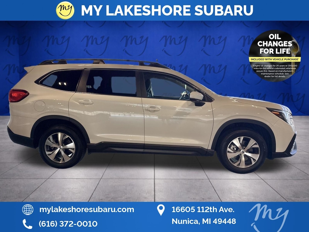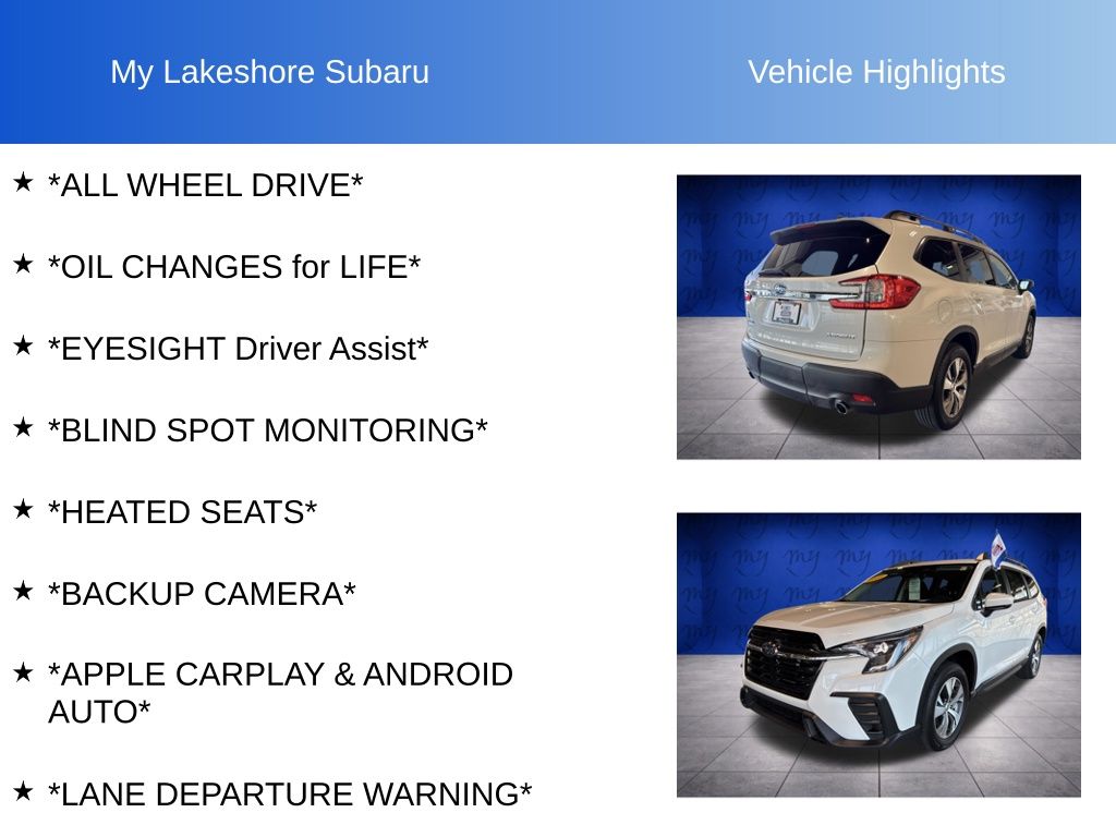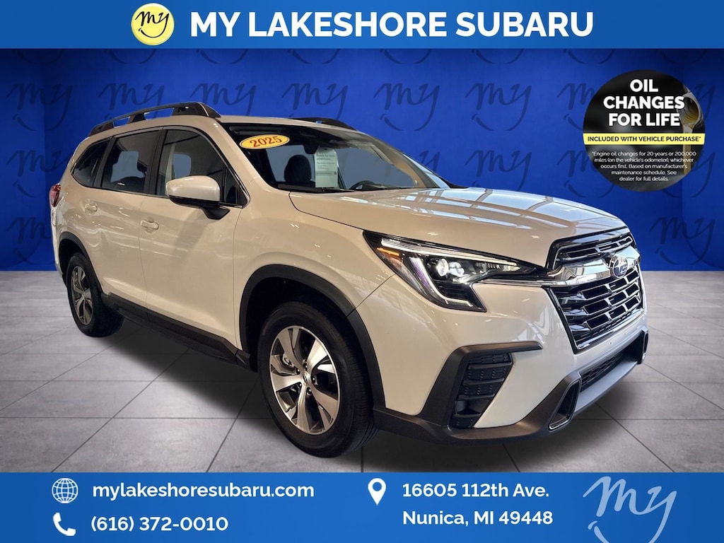 Ascent Premium, Crystal White Pearl, *ALL WHEEL DRIVE*, *APPLE CARPLAY & ANDROID AUTO*, *BACKUP CAMERA*, *BLIND SPOT MONITORING*, *EYESIGHT Driver Assist*, *HEATED SEATS*, *LANE DEPARTURE WARNING*, *OIL CHANGES for LIFE*. Certified. Crystal White Pearl 2025 Subaru Ascent Premium AWD Lineartronic CVT 2.4L 4-Cylinder DOHC 16V