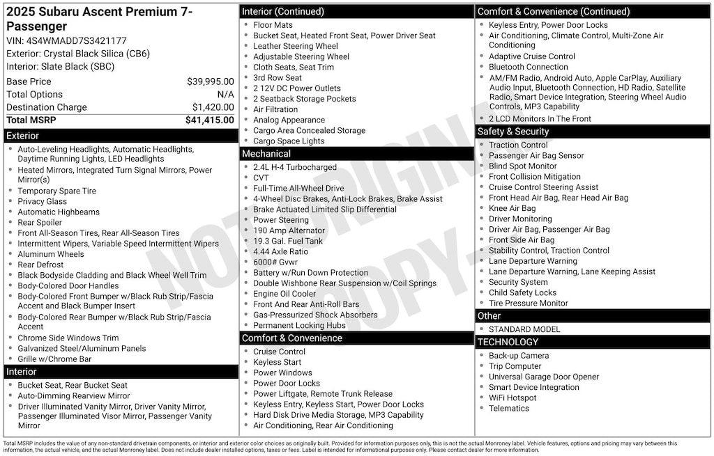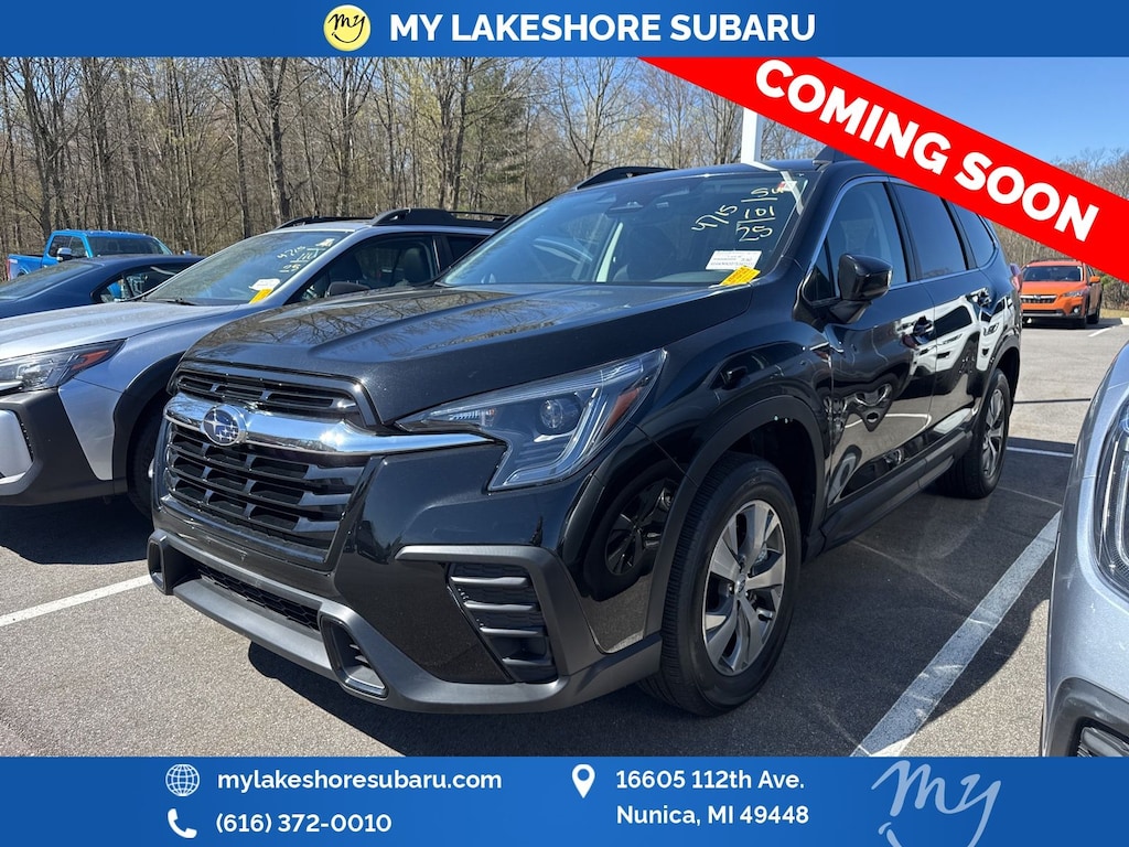 Ascent Premium, Crystal Black Silica, *ALL WHEEL DRIVE*, *APPLE CARPLAY & ANDROID AUTO*, *BACKUP CAMERA*, *BLIND SPOT MONITORING*, *EYESIGHT Driver Assist*, *HEATED SEATS*, *LANE DEPARTURE WARNING*, *OIL CHANGES for LIFE*. Certified. Crystal Black Silica 2025 Subaru Ascent Premium AWD Lineartronic CVT 2.4L 4-Cylinder DOHC 16V