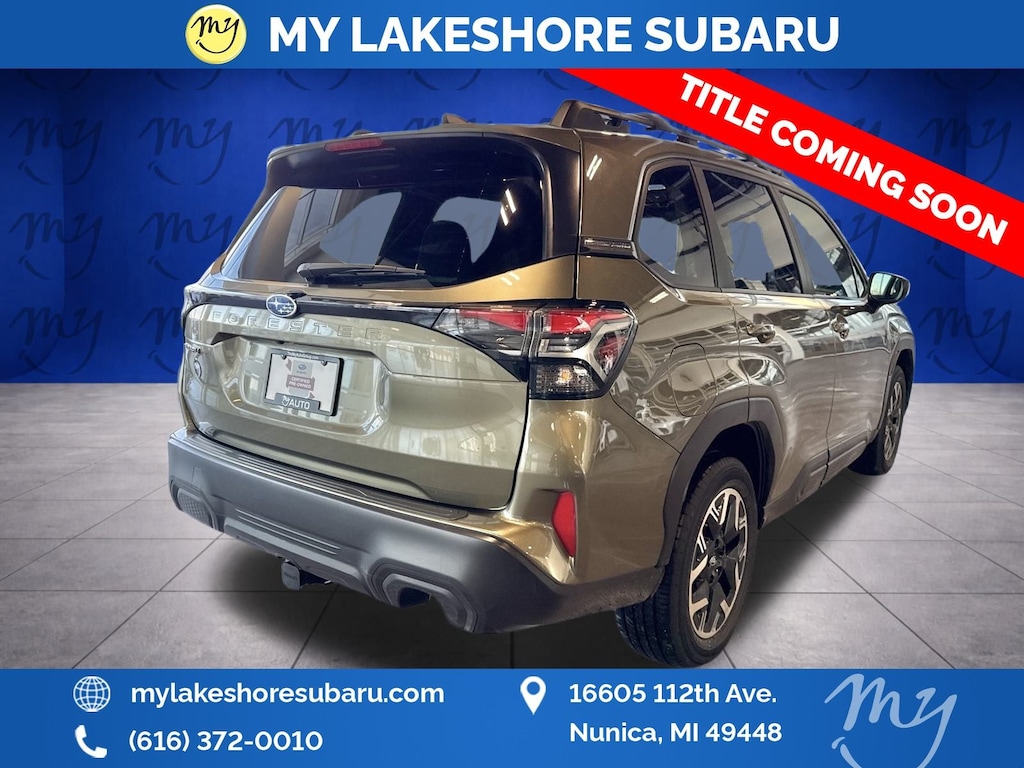 Forester Premium, Autumn Green Metallic, *ALL WHEEL DRIVE*, *APPLE CARPLAY & ANDROID AUTO*, *BACKUP CAMERA*, *EYESIGHT Driver Assist*, *HEATED SEATS*, *LANE DEPARTURE WARNING*, *OIL CHANGES for LIFE*, *PANORAMIC MOONROOF*. Certified. Autumn Green Metallic 2025 Subaru Forester Premium AWD Lineartronic CVT 2.5L 4-Cylinder DOHC 16V