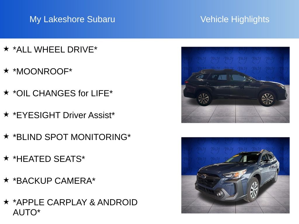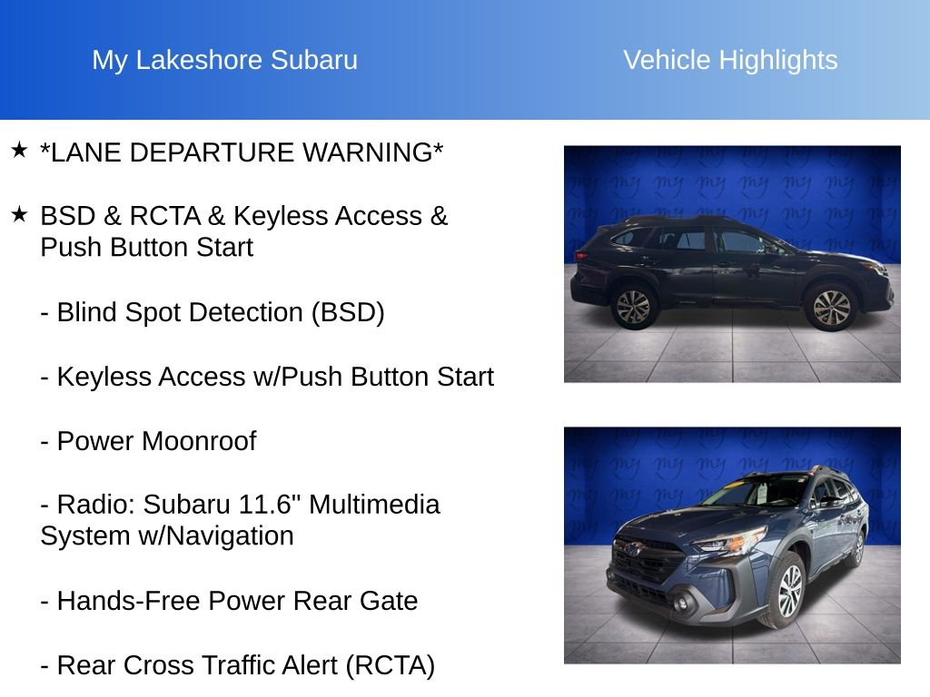 Outback Premium, Cosmic Blue Pearl, *ALL WHEEL DRIVE*, *APPLE CARPLAY & ANDROID AUTO*, *BACKUP CAMERA*, *BLIND SPOT MONITORING*, *EYESIGHT Driver Assist*, *HEATED SEATS*, *LANE DEPARTURE WARNING*, *MOONROOF*, *OIL CHANGES for LIFE*, Blind Spot Detection (BSD), BSD & RCTA & Keyless Access & Push Button Start, Hands-Free Power Rear Gate, Keyless Access w/Push Button Start, Power Moonroof, Radio: Subaru 11.6" Multimedia System w/Navigation, Rear Cross Traffic Alert (RCTA). Certified. Cosmic Blue Pearl 2025 Subaru Outback Premium AWD CVT Lineartronic 2.5L 4-Cylinder DOHC 16V