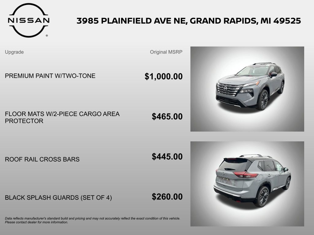 The My Nissan of North Grand Rapids team is ready to provide you with a world-class experience, ensuring that you find the perfect vehicle that fits all your needs. All prices plus tax, title, plate, and $280 documentation fees. My Nissan of North Grand Rapids offers Lifetime Oil Changes Nationwide coverage on your engine, transmission, drive train and coverage on all internally lubricating parts for as long as you own the vehicle in any state. Electric/Hybrid Models are not included in the lifetime powertrain warranty. All prices plus tax, title, plate and $280 documentation fees. Take advantage of our VIP experience by calling 616-361-7361 to schedule a test drive. Read our customer reviews and view our entire selection of New Nissan or preowned vehicles at www.myautograndrapids.com, www.mynissanofgrandrapids.com or stop by today. Price includes: $3500 - Nissan Customer Cash. Exp. 05/04/2026