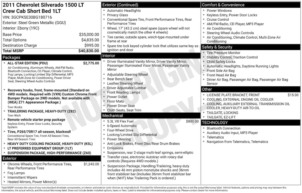 Silverado 1500 LT, 6-Speed Automatic, 4WD, Steel Green Metallic, *CRUISE CONTROL*, *LOCAL TRADE*, *Trailer TOW Package*, 17" x 7.5" 5-Spoke Aluminum Wheels, All-Star Edition, AM/FM Stereo w/CD Player & MP3 Playback, Bluetooth® For Phone, Dual-Zone Automatic Climate Control, EZ-Lift Tailgate, Front Halogen Fog Lamps, Heavy Duty Cooling Package, Heavy-Duty Air-to-Oil External Engine Oil Cooler, Heavy-Duty Auxiliary External Transmission Oil Cooler, Heavy-Duty Rear Automatic Locking Differential, Heavy-Duty Trailering Package, Locking Tailgate, Steering Wheel Mounted Audio Controls, USB Port, XM Radio. Steel Green Metallic 2011 Chevrolet Silverado 1500 LT 4WD 6-Speed Automatic Vortec 5.3L V8 SFI VVT Flex Fuel