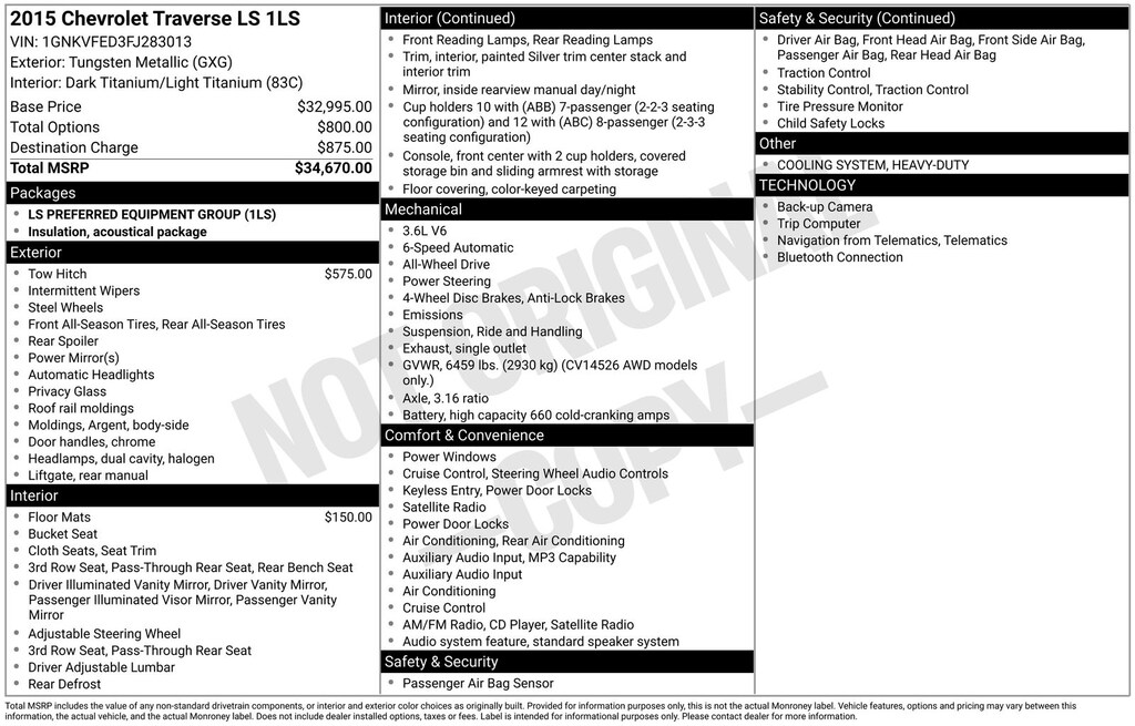Traverse LS, AWD, Tungsten Metallic, *ALL WHEEL DRIVE*, *BACKUP CAMERA*, Airbags, Bluetooth® For Phone, Comfort Grip Urethane Steering Wheel, Enhanced Driver Information Center, Preferred Equipment Group 1LS, Standard Speaker System. Tungsten Metallic 2015 Chevrolet Traverse LS AWD 6-Speed Automatic 3.6L V6 SIDI