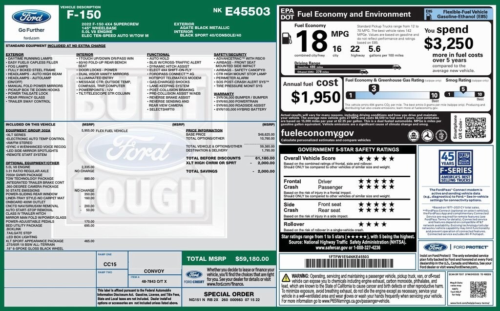 4D SuperCrew, 5.0L V8, 4WD, Black w/Unique Sport Cloth 40/Console/40 Power Front Seat, *4WD*, *APPEARANCE PACKAGE*, *APPLE CARPLAY & ANDROID AUTO*, *BLIND SPOT MONITORING SYSTEM*, *FACTORY TOW Package*, *FULLY SERVICED*, *HANDSFREE BLUETOOTH*, *HEATED SEATS*, *JUST ARRIVED*, *LANE DEPARTURE WARNING*, *OIL CHANGES for LIFE*, *PREMIUM WHEELS*, *REMOTE START*, *SUPER BUY*, *VERY CLEAN*, 10-Way Power Driver & Passenger Seats, 2-Bar Style Grille w/Chrome 2 Minor Bars, 360 Degree Camera, 8" Productivity Screen in Instrument Cluster, Accent-Color Step Bars, Auto-Dimming Rear-View Mirror, Black 2-Bar Style Grille w/Black Surround/Accents, Body-Color Door & Tailgate Handles, Body-Color Front & Rear Bumpers, Box Side Decals, Bright Polished Step Bars, Chrome Door & Tailgate Handles w/Body-Color Bezel, Chrome Single-Tip Exhaust, Class IV Trailer Hitch Receiver, Dual Zone Electronic Automatic Temperature Control, Equipment Group 302A High, Heated Front Seats, Integrated Trailer Brake Controller, Intelligent Access w/Push Button Start, Leather-Wrapped Steering Wheel, LED Reflector Headlamps, LED Sideview Mirror Spotlights, Onboard 400W Outlet, Power Glass Heated Sideview Mirrors, Pro Trailer Backup Assist, Radio: AM/FM SiriusXM w/360L, Rear Under-Seat Storage, Remote Start System w/Remote Tailgate Release, SecuriCode Drivers Side Keyless-Entry Keypad, SYNC 4 w/Enhanced Voice Recognition, Tow Technology Package, Unique Sport Cloth 40/Console/40 Front-Seats, Wheels: 18" 6-Spoke Machined Aluminum, XLT Chrome Appearance Package, XLT Sport Appearance Package, Zone Lighting. 2022 Ford F-150 XLT Agate Black Metallic YOUR BEST PRICE on ANY NEW FORD is at Alma Ford. Get the MOST MONEY for your TRADE and BEST PRICE GUARANTEE on ANY NEW FORD! Alma Ford is your #1 choice in Michigan to get the BEST PRICE on any NEW Ford and HOME of the OIL Changes for LIFE*. The Alma Ford team is ready to provide you with a world-class experience, ensuring that you find the perfect vehicle that fits all your needs. Every vehicle has been through a 172 point safety inspection completed by a certified technicians and fully detailed. We sell many makes and models, Pre-Owned Ford Vehicles 2025-2024-2023-2022-2021-2020-2019-2018-2017-2016-2015-2014-2013-2012-2011-2010 Ford Bronco, Bronco Sport, Edge, Escapes, Expedition, Explorer, Fusions, Focus, Flex, F-150 Series, F-250, F-350, Super Duty Diesel Trucks, Maverick, Mustang MACH-E, Mustang, Ranger, Transit, and more For sale. Take advantage of our VIP experience by calling 989-699-5260 to schedule a test drive. Read our customer reviews at www.almaford.com/customer-testimonials or view our entire selection of new and preowned vehicles at www.almaford.com, or stop by today, located at 2051 W Monroe, Alma, MI 48801. 2022 Ford F-150 XLT 4WD 10-Speed Automatic 5.0L V8