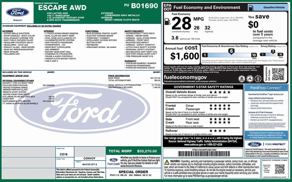 Escape Active, 4D Sport Utility, 1.5L EcoBoost, AWD, *ALL WHEEL DRIVE*, *APPLE CARPLAY & ANDROID AUTO*, *BLIND SPOT MONITORING SYSTEM*, *COLD WEATHER Package*, *FULLY SERVICED*, *HANDSFREE BLUETOOTH*, *HEATED SEATS*, *HEATED STEERING WHEEL*, *JUST ARRIVED*, *LANE DEPARTURE WARNING*, *OIL CHANGES for LIFE*, *REMOTE START*, *SUPER BUY*, *VERY CLEAN*, Equipment Group 200A, SYNC 4, Wheels: 17" Shadow Silver-Painted Aluminum. 2023 Ford Escape Active Carbonized Gray Metallic YOUR BEST PRICE on ANY NEW FORD is at Alma Ford. Get the MOST MONEY for your TRADE and BEST PRICE GUARANTEE on ANY NEW FORD! Alma Ford is your #1 choice in Michigan to get the BEST PRICE on any NEW Ford and HOME of the OIL Changes for LIFE*. The Alma Ford team is ready to provide you with a world-class experience, ensuring that you find the perfect vehicle that fits all your needs. Every vehicle has been through a 172 point safety inspection completed by a certified technicians and fully detailed. We sell many makes and models, Pre-Owned Ford Vehicles 2025-2024-2023-2022-2021-2020-2019-2018-2017-2016-2015-2014-2013-2012-2011-2010 Ford Bronco, Bronco Sport, Edge, Escapes, Expedition, Explorer, Fusions, Focus, Flex, F-150 Series, F-250, F-350, Super Duty Diesel Trucks, Maverick, Mustang MACH-E, Mustang, Ranger, Transit, and more For sale. Take advantage of our VIP experience by calling 989-699-5260 to schedule a test drive. Read our customer reviews at www.almaford.com/customer-testimonials or view our entire selection of new and preowned vehicles at www.almaford.com, or stop by today, located at 2051 W Monroe, Alma, MI 48801. 2023 Ford Escape Active AWD 8-Speed Automatic 1.5L EcoBoost