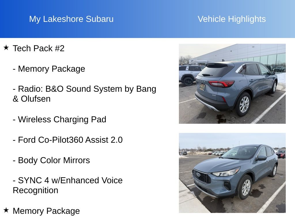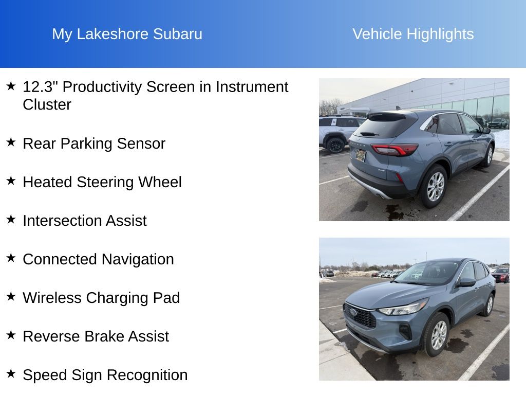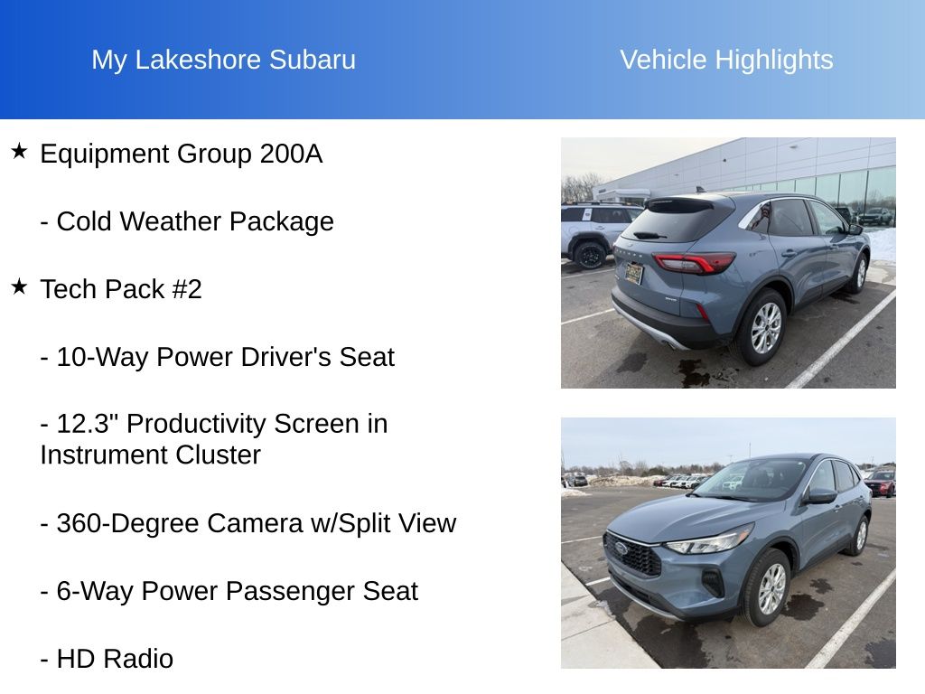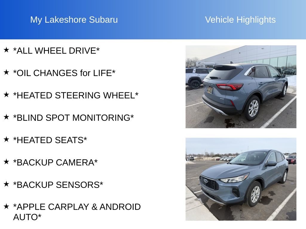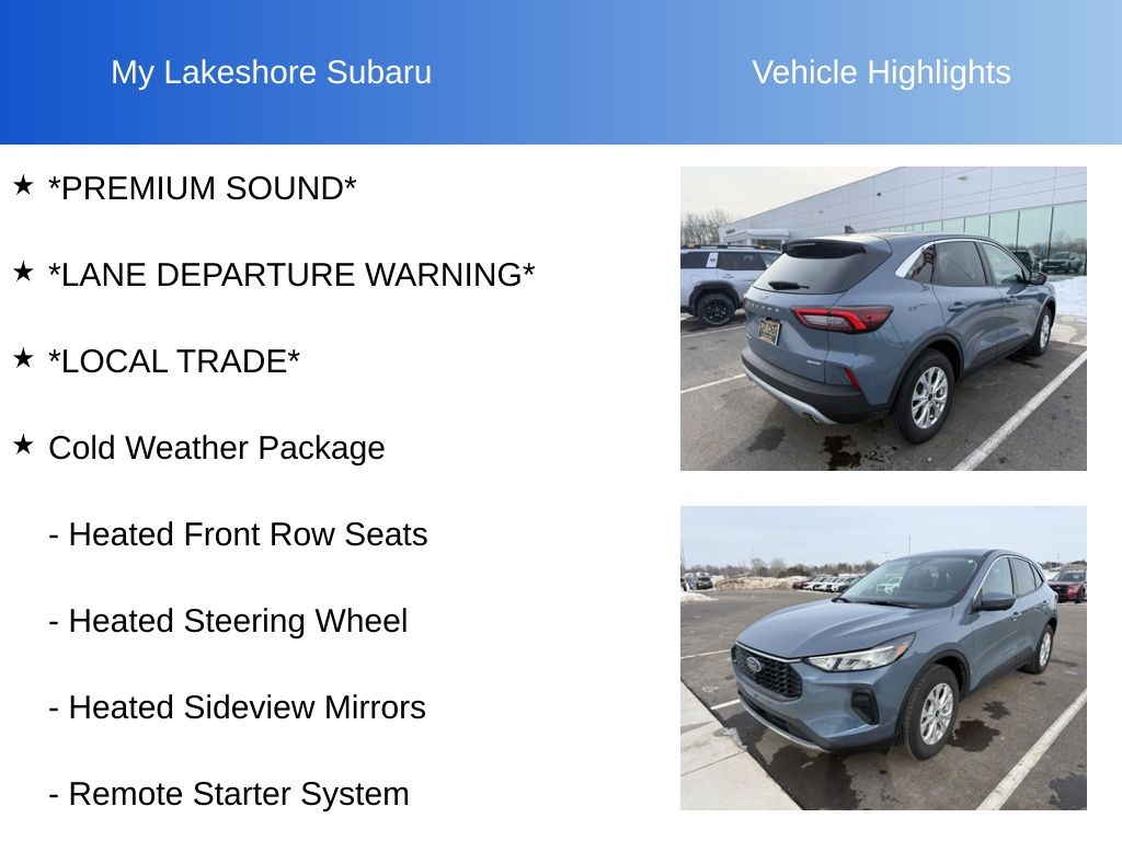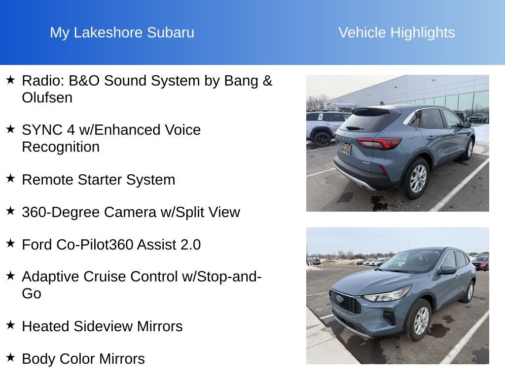 Escape Active, AWD, Vapor Blue Metallic, *ALL WHEEL DRIVE*, *APPLE CARPLAY & ANDROID AUTO*, *BACKUP CAMERA*, *BACKUP SENSORS*, *BLIND SPOT MONITORING*, *HEATED SEATS*, *HEATED STEERING WHEEL*, *LANE DEPARTURE WARNING*, *LOCAL TRADE*, *OIL CHANGES for LIFE*, *PREMIUM SOUND*, 10-Way Power Driver's Seat, 12.3" Productivity Screen in Instrument Cluster, 360-Degree Camera w/Split View, 6-Way Power Passenger Seat, Adaptive Cruise Control w/Stop-and-Go, Body Color Mirrors, Cold Weather Package, Connected Navigation, Equipment Group 200A, Ford Co-Pilot360 Assist 2.0, HD Radio, Heated Front Row Seats, Heated Sideview Mirrors, Heated Steering Wheel, Intersection Assist, Memory Package, Radio: B&O Sound System by Bang & Olufsen, Rear Parking Sensor, Remote Starter System, Reverse Brake Assist, Speed Sign Recognition, SYNC 4 w/Enhanced Voice Recognition, Tech Pack #2, Wireless Charging Pad. Vapor Blue Metallic 2024 Ford Escape Active AWD 8-Speed Automatic 1.5L EcoBoost