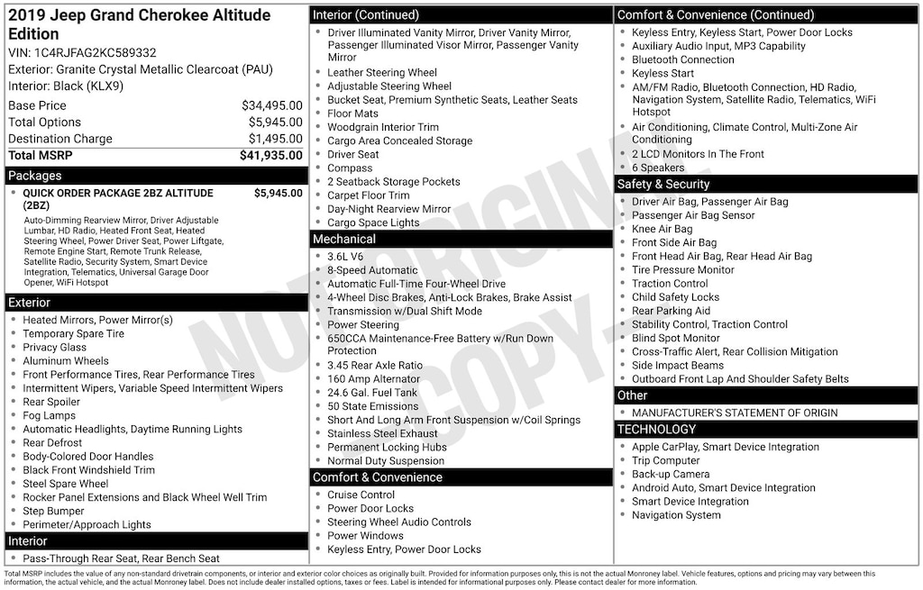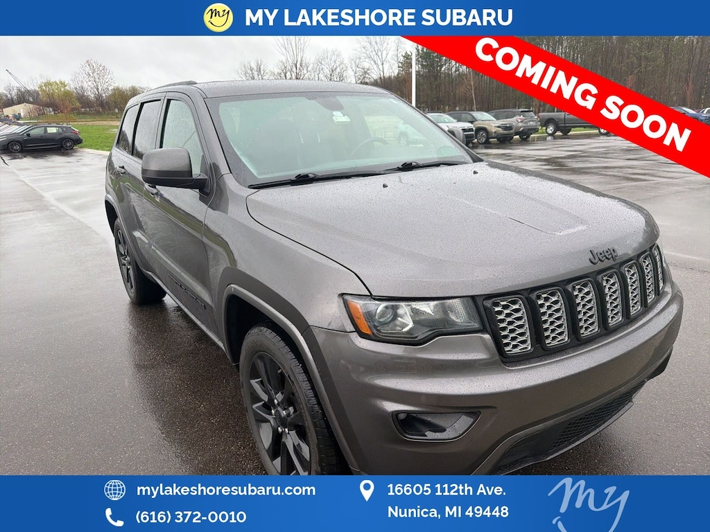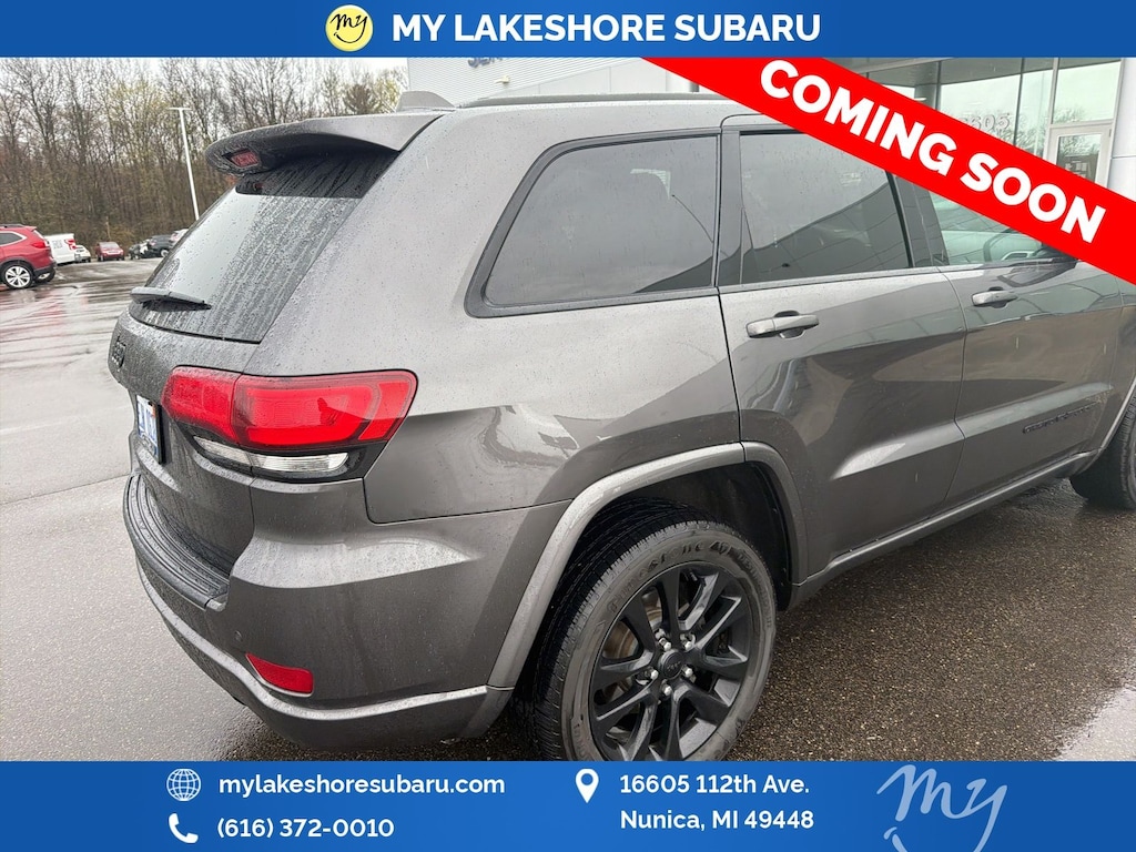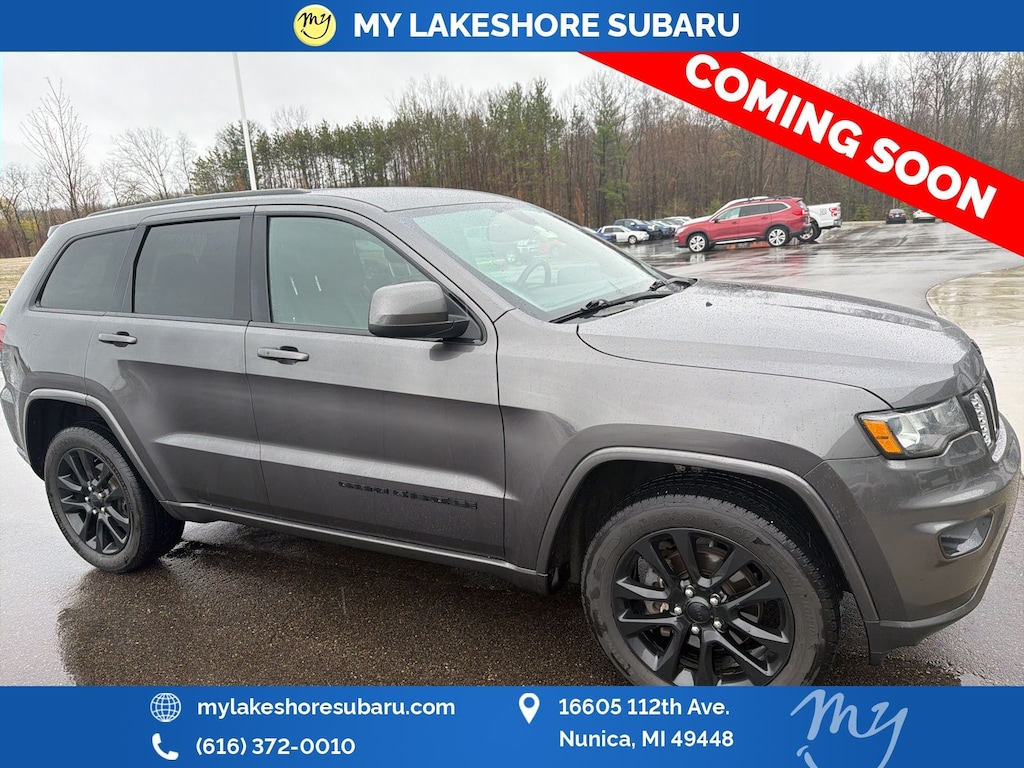 Grand Cherokee Altitude, Granite Crystal Metallic Clearcoat, *APPLE CARPLAY & ANDROID AUTO*, *BACKUP CAMERA*, *HEATED SEATS*, *HEATED STEERING WHEEL*, *LOCAL TRADE*, *NAVIGATION*, 1-Year SiriusXM Radio Service, 1-Yr SiriusXM Guardian Trial, 115V Auxiliary Power Outlet, 4G LTE Wi-Fi Hot Spot, 5-Year SiriusXM Traffic Service, 5-Year SiriusXM Travel Link Service, 8.4" Touchscreen Display, Altitude Grille, Altitude IV Package, Apple CarPlay, Auto-Dimming Rear-View Mirror, Black Suede Seats w/Black Stitching, Body Color Claddings, Body Color Fascia, Body Color Shark Fin Antenna, Dark Day Light Opening Moldings, Dark Headlamp Bezel Finish, Dark Lens Taillamps, Front Accent/Body Color Fascia, Gloss Black Rear Fascia Applique, Google Android Auto, GPS Antenna Input, GPS Navigation, HD Radio, Instrument Cluster w/Off-Road Disp. Pages, Integrated Center Stack Radio, Integrated Voice Command w/Bluetooth, Jeep Black Gloss Badging, Power 4-Way Driver Lumbar Adjust, Power 8-Way Driver/Manual Passenger Seat, Power Liftgate, Quick Order Package 2BZ Altitude, Radio: Uconnect 4C Nav w/8.4" Display, Rear Accent/Body Color Fascia, Rear Fascia Black MIC Step Pad, Security & Convenience Group, Security Alarm, Single Exhaust w/Bright Tip, SiriusXM Satellite Radio, SiriusXM Traffic Plus, SiriusXM Travel Link, Steering Wheel Mounted Audio Controls, Universal Garage Door Opener, USB Host Flip, Wheels: 20" x 8.0" Gloss Black Aluminum. Granite Crystal Metallic Clearcoat 2019 Jeep Grand Cherokee Altitude 4WD 8-Speed Automatic 3.6L V6 24V VVT