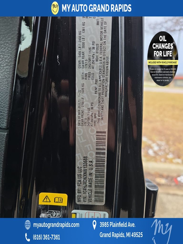 Wrangler Unlimited Sport S, 2.0L I4 DOHC, 4WD, Black Clearcoat, *APPLE CARPLAY & ANDROID AUTO*, *BACKUP CAMERA*, *BLUETOOTH*, *OIL CHANGES for LIFE*, *SUPER BUY*, *VERY CLEAN*, Automatic Headlamps, Convenience Group, Deep Tint Sunscreen Windows, Front 1-Touch Down Power Windows, Leather Wrapped Steering Wheel, Power Heated Mirrors, Quick Order Package 22S Sport S, Remote Keyless Entry, Remote Start System, Security Alarm, Speed Sensitive Power Locks, Sport S, Sun Visors w/Illuminated Vanity Mirrors, Universal Garage Door Opener, Wheels: 17" x 7.5" Tech Silver Aluminum. My Auto Grand Rapids is your #1 choice in Michigan to get the BEST PRICE on used vehicles and BEST value for your trade. The My Auto Grand Rapids team is ready to provide you with a world-class experience, ensuring that you find the perfect vehicle that fits all your needs. Every vehicle has been through a full safety inspection, completed by certified technicians and fully detailed. We sell many makes and models with years from 2025, 2024, 2023, 2022, 2021, 2020, 2019, 2018, 2017, 2016, 2015, 2014, 2013, 2012, 2011, 2010, 2009 and used makes Audi, BMW, Chevrolet, Toyota, Volkswagen, Kia, Hyundai, Mercedes, Dodge, Chrysler, Jeep, Ram, Lincoln, Ford, Nissan, Honda, Mitsubishi, Subaru, and many models like Altima, Murano, Pathfinder, Kicks, Taos, Beetle, Jetta, Outlander, Eclipse Sport, Frontier, Rogue, Atlas, Versa, and more. Take advantage of our VIP experience by calling 616-361-7361 to schedule a test drive. Read our customer reviews and view our entire selection of preowned vehicles at www.myautograndrapids.com, or stop by today, located at 3985 Plainfield Ave NE, Grand Rapids, MI 49525.