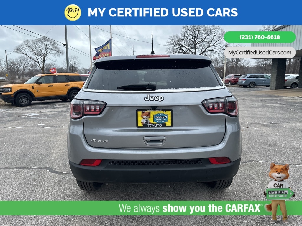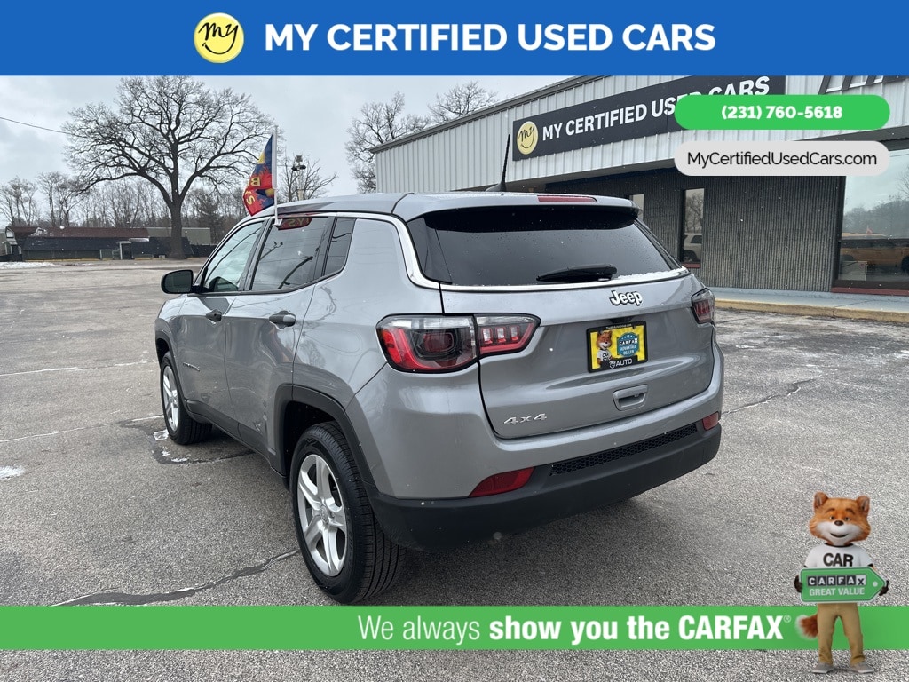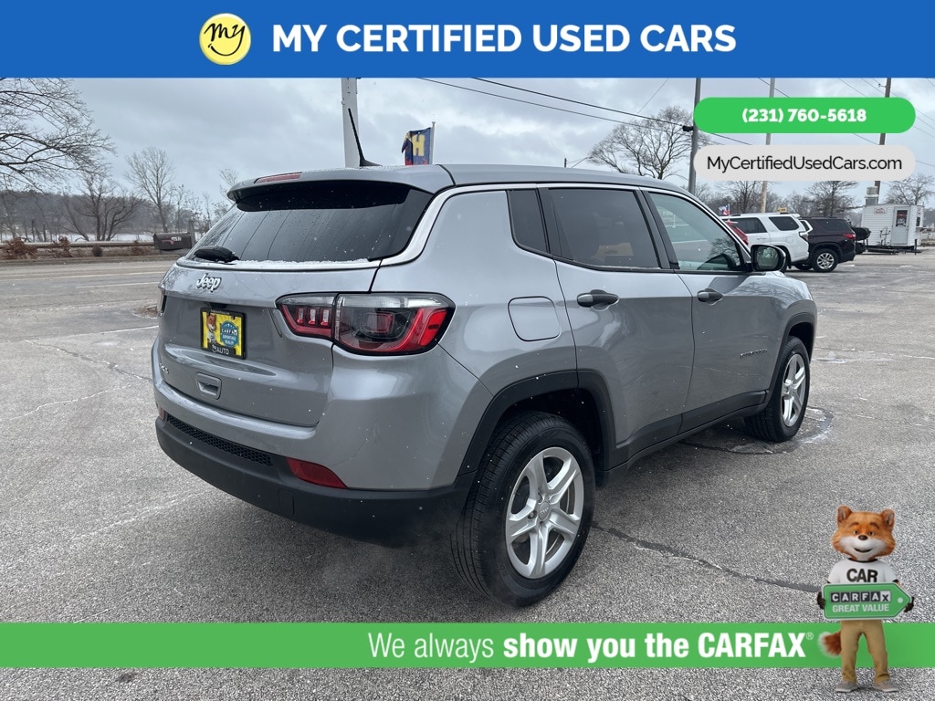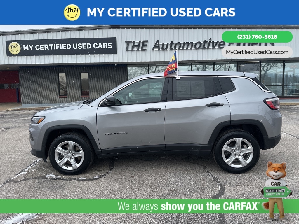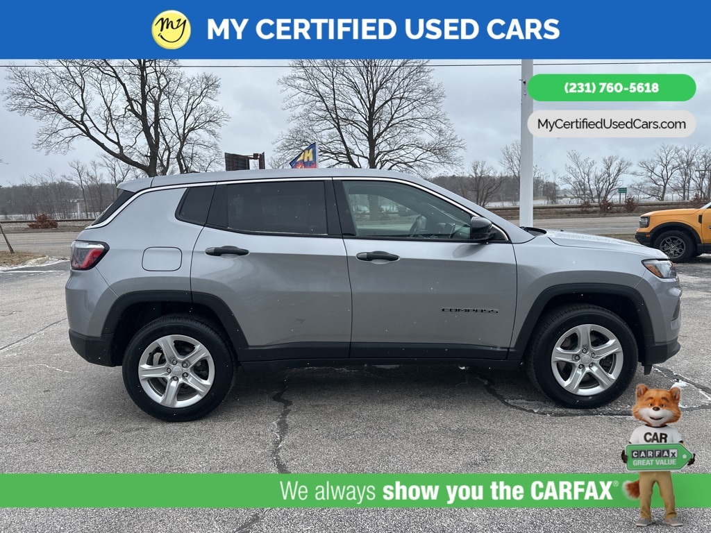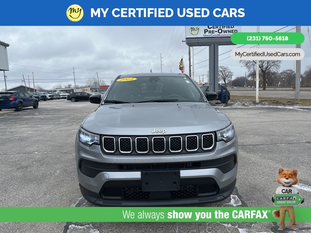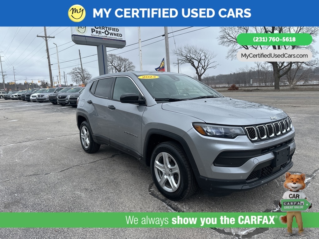 *FULLY SERVICED* ***2023 JEEP COMPASS SPORT 4WD***, *VERY CLEAN* *BLIND SPOT MONITORING SYSTEM*, *LANE DEPARTURE WARNING*, *REARVIEW CAMERA*, *APPLE CARPLAY & ANDROID AUTO* *Cloth Low-Back Bucket Seats* , *ParkView Rear Back-Up Camera* , *Quick Order Package 29A* , *Radio: Uconnect 5 w/10.1" Display*. MY Certified Used Cars of Muskegon is your #1 choice in Michigan to get the BEST PRICE on used vehicles and BEST value for your trade. The MY Certified Used Cars team is ready to provide you with a world-class experience, ensuring that you find the perfect vehicle that fits all your needs. Every vehicle has been through a full safety inspection completed by certified technicians and fully detailed. We sell many makes and models, Pre-Owned Vehicles with years from 2025-2024-2023-2022-2021-2020-2019-2018-2017-2016-2015-2014-2013-2012-2011-2010-2009-2008-2007 and all makes Audi, BMW, Chevrolet, Toyota, Volkswagen, Kia, Hyundai, Mercedes, Dodge, Chrysler, Jeep, Ram, Lincoln, Honda, Subaru, and many models like Bronco, Bronco Sport, Edge, Escapes, Expedition, Explorer, Fusions, Focus, Flex, F-150 Series, F-250, F-350, Super Duty Diesel Trucks, Maverick, Mustang MACH-E, Mustang, Ranger, Transit, Wrangler, Grand Cherokee, Grand Cherokee L, Wagoneer, Gladiator, Grand Caravan, RAM, RAM HEMI, and more. Take advantage of our VIP experience by calling 231-760-5618 to schedule a test drive. Read our customer reviews at www.mycertifiedusedcars.com/testimonials or view our entire selection of preowned vehicles at www.mycertifiedusedcars.com, or stop by today, located at 3692 Airline Rd. Muskegon, MI 49444. Billet Silver Metallic Clearcoat 2023 Jeep Compass Sport 4WD 8-Speed Automatic 2.0L I4 DOHC