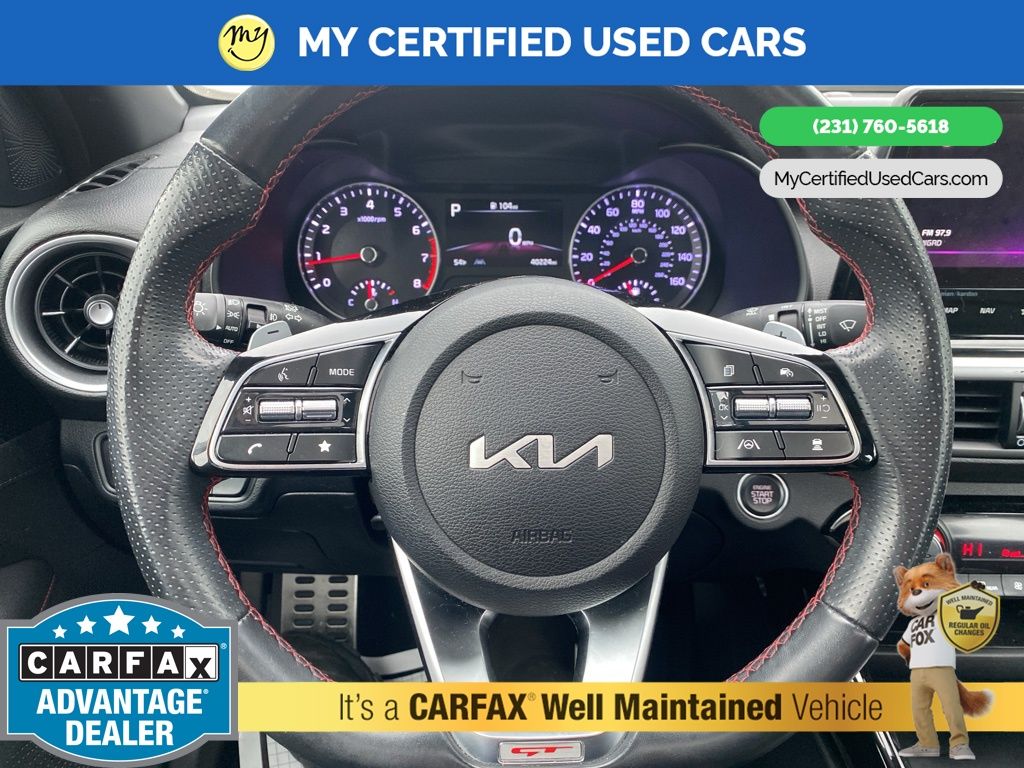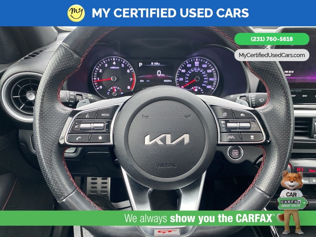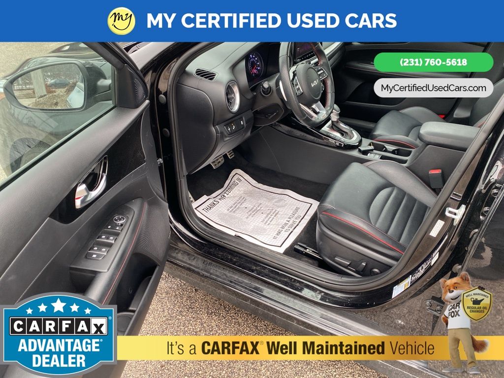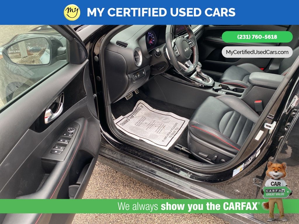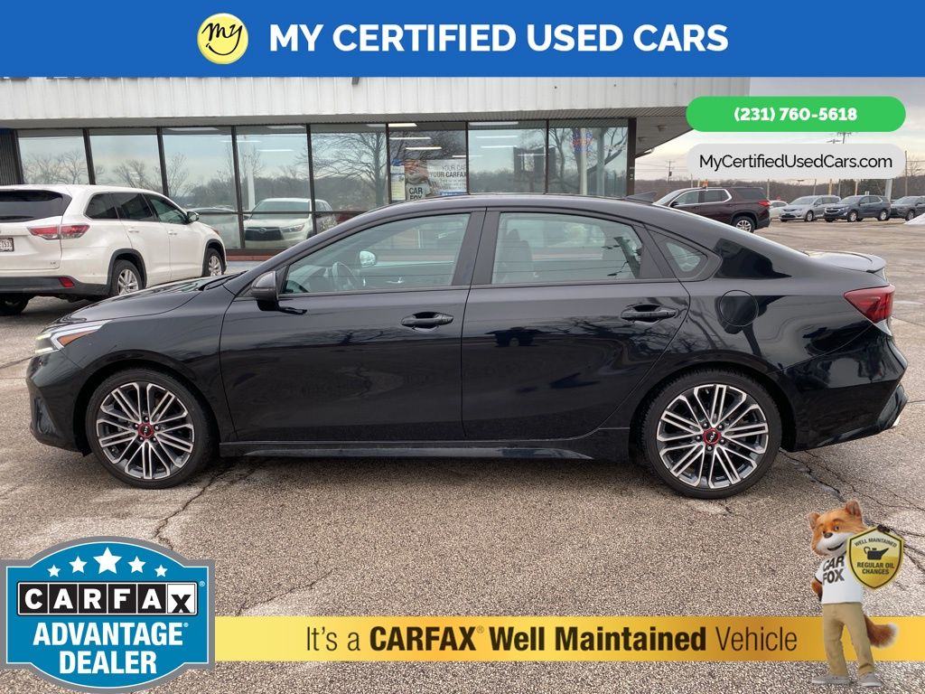 *FULLY SERVICED* ***2022 KIA FORTE GT*** *SUPER BUY*, *VERY CLEAN* **REMOTE START** *LEATHER HEATED/COOLED POWER SEATS* *BLIND SPOT MONITORING SYSTEM*, *LANE DEPARTURE WARNING*, **REAR CROSS-TRAFFIC COLLISION-AVOIDANCE**, *NAVIGATION SYSTEM*, *PREMIUM SOUND* *SUNROOF* *APPLE CARPLAY & ANDROID AUTO*, *REARVIEW CAMERA*, 10-Way Power Driver's Seat, Electronic Parking Brake (EPB) w/Auto Hold, Forward Collision Avoidance-Assist - Cyclist, Front dual zone A/C, GT2 Package, Heated & Ventilated Front Seats, Highway Driving Assist (HDA), Navigation System, Navigation-Based Smart Cruise Control (NSCC), Overhead LED Front & Rear Reading Lamps, Parking Distance Warning-Reverse, Power Sunroof, Radio: AM/FM/MP3 harman/kardon Premium Audio System, Smart Cruise Control, SynTex Seat Trim, Wheels: 18" Machine Finish Alloy. MY Certified Used Cars of Muskegon is your #1 choice in Michigan to get the BEST PRICE on used vehicles and BEST value for your trade. The MY Certified Used Cars team is ready to provide you with a world-class experience, ensuring that you find the perfect vehicle that fits all your needs. Every vehicle has been through a full safety inspection completed by certified technicians and fully detailed. We sell many makes and models, Pre-Owned Vehicles with years from 2025-2024-2023-2022-2021-2020-2019-2018-2017-2016-2015-2014-2013-2012-2011-2010-2009-2008-2007 and all makes Audi, BMW, Chevrolet, Toyota, Volkswagen, Kia, Hyundai, Mercedes, Dodge, Chrysler, Jeep, Ram, Lincoln, Honda, Subaru, and many models like Bronco, Bronco Sport, Edge, Escapes, Expedition, Explorer, Fusions, Focus, Flex, F-150 Series, F-250, F-350, Super Duty Diesel Trucks, Maverick, Mustang MACH-E, Mustang, Ranger, Transit, Wrangler, Grand Cherokee, Grand Cherokee L, Wagoneer, Gladiator, Grand Caravan, RAM, RAM HEMI, and more. Take advantage of our VIP experience by calling 231-760-5618 to schedule a test drive. Read our customer reviews at www.mycertifiedusedcars.com/testimonials or view our entire selection of preowned vehicles at www.mycertifiedusedcars.com, or stop by today, located at 3692 Airline Rd. Muskegon, MI 49444. Aurora Black Pearl 2022 Kia Forte GT FWD 7-Speed Automatic 1.6L 4-Cylinder Clean CARFAX.