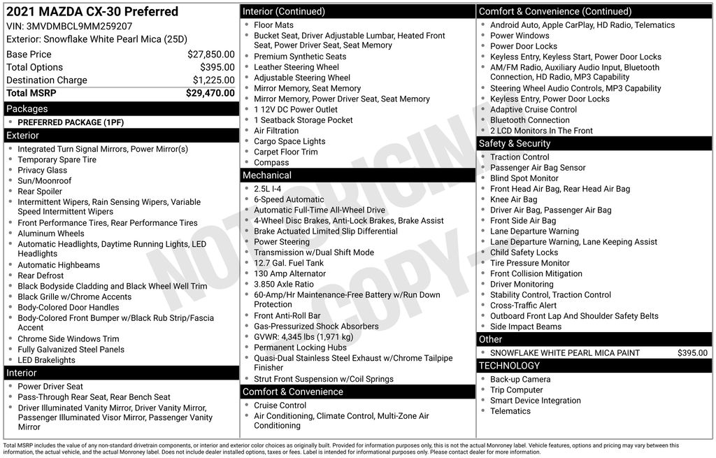 CX-30 Preferred, AWD, Snowflake White Pearl Mica, Black Artificial Leather, *ADAPTIVE CRUISE*, *APPLE CARPLAY & ANDROID AUTO*, *AWD*, *BACKUP CAMERA*, *BLIND SPOT ALERT*, *HANDSFREE BLUETOOTH*, *LANE DEPARTURE WARNING*, *LANE KEEPING ASSIST*, *LEATHER HEATED POWER SEATS*, *MEMORY SEATS*, *MOONROOF*, *OIL CHANGES for LIFE*, *PREMIUM WHEELS*, Preferred Package. My Auto Grand Rapids is your #1 choice in Michigan to get the BEST PRICE on used vehicles and BEST value for your trade. The My Auto Grand Rapids team is ready to provide you with a world-class experience, ensuring that you find the perfect vehicle that fits all your needs. Every vehicle has been through a full safety inspection, completed by certified technicians and fully detailed. We sell many makes and models with years from 2025, 2024, 2023, 2022, 2021, 2020, 2019, 2018, 2017, 2016, 2015, 2014, 2013, 2012, 2011, 2010, 2009 and used makes Audi, BMW, Chevrolet, Toyota, Volkswagen, Kia, Hyundai, Mercedes, Dodge, Chrysler, Jeep, Ram, Lincoln, Ford, Nissan, Honda, Mitsubishi, Subaru, and many models like Altima, Murano, Pathfinder, Kicks, Taos, Beetle, Jetta, Outlander, Eclipse Sport, Frontier, Rogue, Atlas, Versa, and more. Take advantage of our VIP experience by calling 616-361-7361 to schedule a test drive. The title is in transit and this vehicle is not available for sale. Read our customer reviews and view our entire selection of preowned vehicles at www.myautograndrapids.com, or stop by today, located at 3985 Plainfield Ave NE, Grand Rapids, MI 49525.