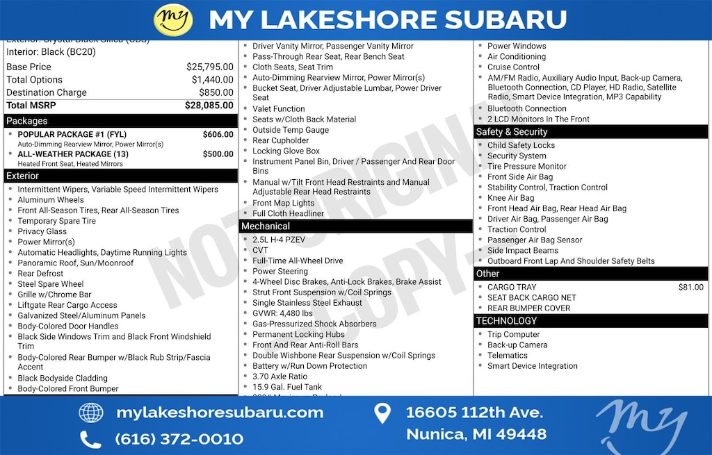 My Lakeshore Subaru is your #1 choice in Michigan to get the BEST PRICE on used vehicles and BEST value for your trade. The My Lakeshore Subaru team is ready to provide you with a world-class experience, ensuring that you find the perfect vehicle that fits all your needs. Every vehicle has been through a full safety inspection completed by certified technicians and fully detailed. We sell many makes and models, Certified Pre-owned Subaruâs and Pre-owned Vehicles with years from 2025-2024-2023-2022-2021-2020-2019-2018-2017-2016-2015-2014-2013-2012-2011-2010-2009-2008-2007 and all makes Audi, BMW, Chevrolet, Toyota, Volkswagen, Kia, Hyundai, Mazda, Mercedes, Dodge, Chrysler, Jeep, Ram, Lincoln, Honda, Subaru, and many models like Crosstrek, Outback, Forester, Accent, Legacy, WRX, BRZ, Solterra, and more. Take advantage of our VIP experience by calling 231-867-6957 to schedule a test drive. Read our customer reviews and view our entire selection of preowned vehicles at www.mylakeshoresubaru.com, or stop by today, located at 16605 112th Ave, Nunica, MI 49448. Recent Arrival! 24/32 City/Highway MPG