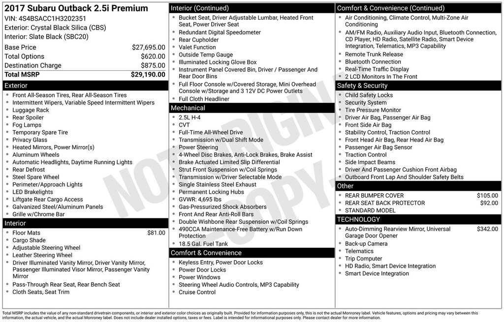 Outback 2.5i Premium, Crystal Black Silica, *ALL WHEEL DRIVE*, *LOCAL TRADE*. Crystal Black Silica 2017 Subaru Outback 2.5i Premium AWD CVT Lineartronic 2.5L 4-Cylinder DOHC 16V