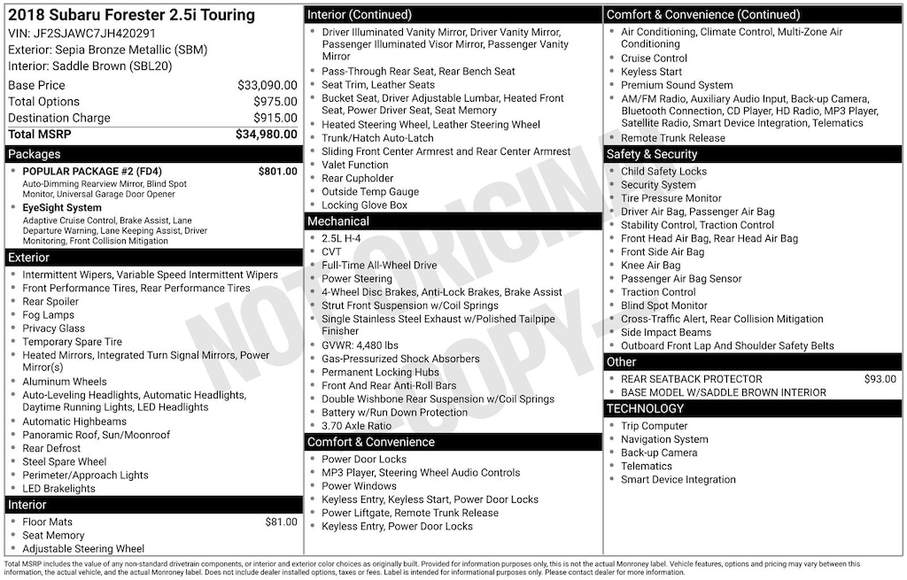 Forester 2.5i Touring, Sepia Bronze Metallic, *ALL WHEEL DRIVE*, *BACKUP CAMERA*, *BLIND SPOT MONITORING*, *EYESIGHT Driver Assist*, *HEATED STEERING WHEEL*, *LANE DEPARTURE WARNING*, *LEATHER HEATED POWER SEATS*, *LOCAL TRADE*, *OIL CHANGES for LIFE*, *PANORAMIC MOONROOF*, *PREMIUM SOUND*. Sepia Bronze Metallic 2018 Subaru Forester 2.5i Touring AWD Lineartronic CVT 2.5L 4-Cylinder DOHC 16V VVT