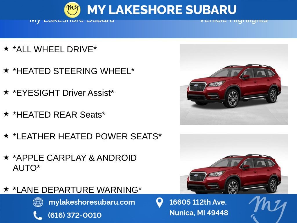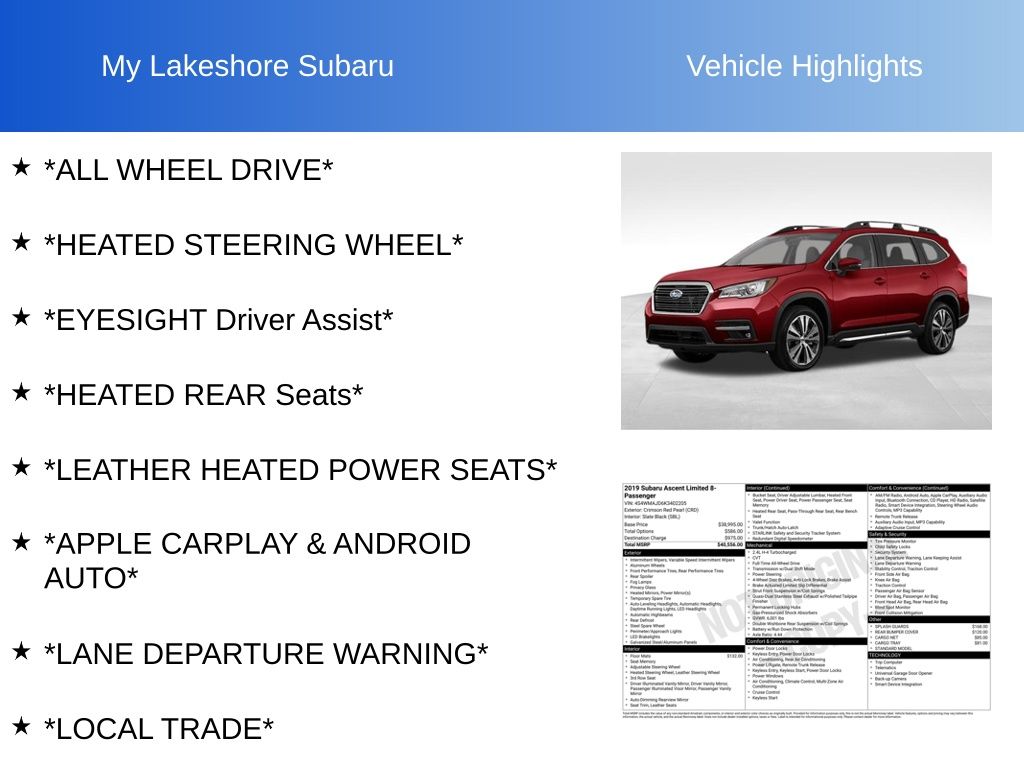 Ascent Limited, AWD, *ALL WHEEL DRIVE*, *APPLE CARPLAY & ANDROID AUTO*, *EYESIGHT Driver Assist*, *HEATED REAR Seats*, *HEATED STEERING WHEEL*, *LANE DEPARTURE WARNING*, *LEATHER HEATED POWER SEATS*, *LOCAL TRADE*. Crimson Red Pearl 2019 Subaru Ascent Limited AWD Lineartronic CVT 2.4L DOHC
