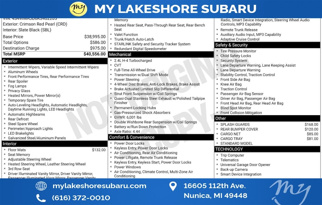 My Lakeshore Subaru is proud to service customer's saving you time & money on any Pre-owned vehicle! See dealer for complete details, dealer is not responsible for pricing errors, all prices, plus tax, title, plate, and doc fees. Serving Nunica and all of our surrounding cities like Norton Shores, Grandville, Greenville, Grand Rapids, Lansing, Kalamazoo, Walker, Comstock Park, Grand Haven, Holland, Wyoming, North Muskegon, Fruitport, Hudsonville, Spring Lake, Wolf Lake, Rockford, Zeeland, Kent City, Sparta, Coopersville, Allendale, Whitehall, and anywhere in the great state of Michigan. Buy from My Lakeshore Subaru in Nunica, MI and you will receive a best-in-class experience. Some of our used vehicles may be subject to unrepaired safety recalls. Check for a vehicle's unrepaired recalls by VIN at http://vinrcl.safercar.gov/vin/.