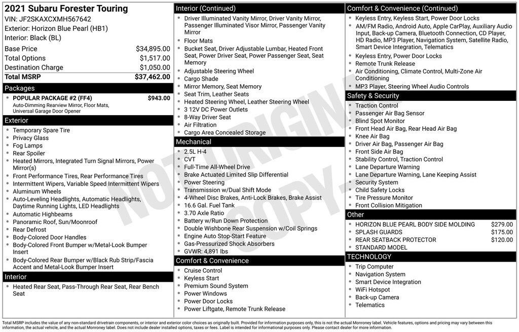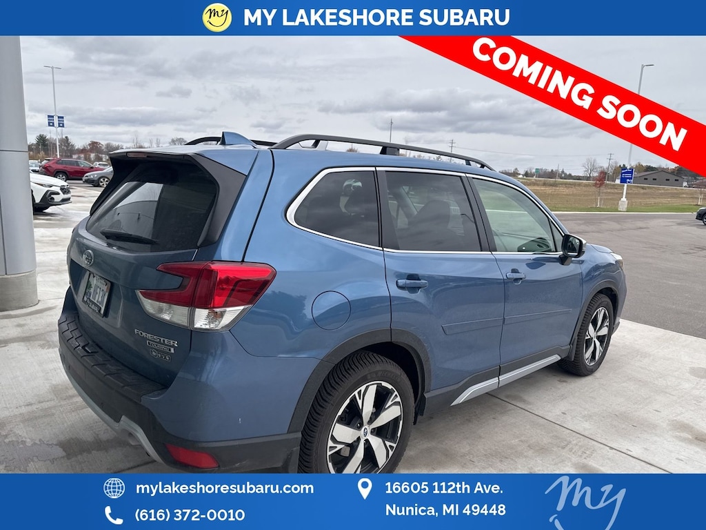 Forester Touring, Horizon Blue Pearl, *ALL WHEEL DRIVE*, *APPLE CARPLAY & ANDROID AUTO*, *BLIND SPOT MONITORING*, *EYESIGHT Driver Assist*, *HEATED STEERING WHEEL*, *LANE DEPARTURE WARNING*, *LEATHER HEATED POWER SEATS*, *LOCAL TRADE*, *OIL CHANGES for LIFE*, *PANORAMIC MOONROOF*, *TOW PACKAGE*. Certified. Horizon Blue Pearl 2021 Subaru Forester Touring AWD Lineartronic CVT 2.5L 4-Cylinder DOHC 16V VVT