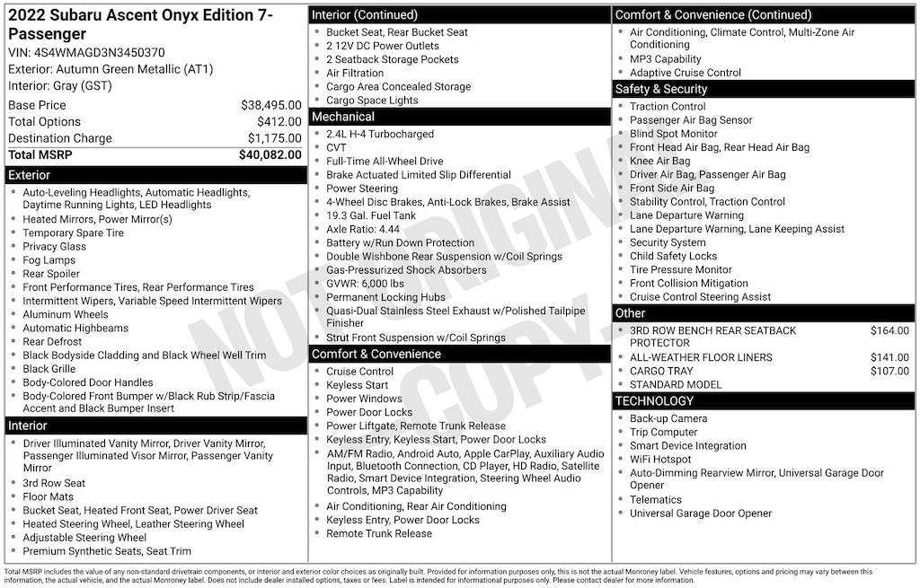 Autumn Green Metallic 2022 Subaru Ascent Onyx Edition AWD Lineartronic CVT 2.4L 4-Cylinder DOHC 16V