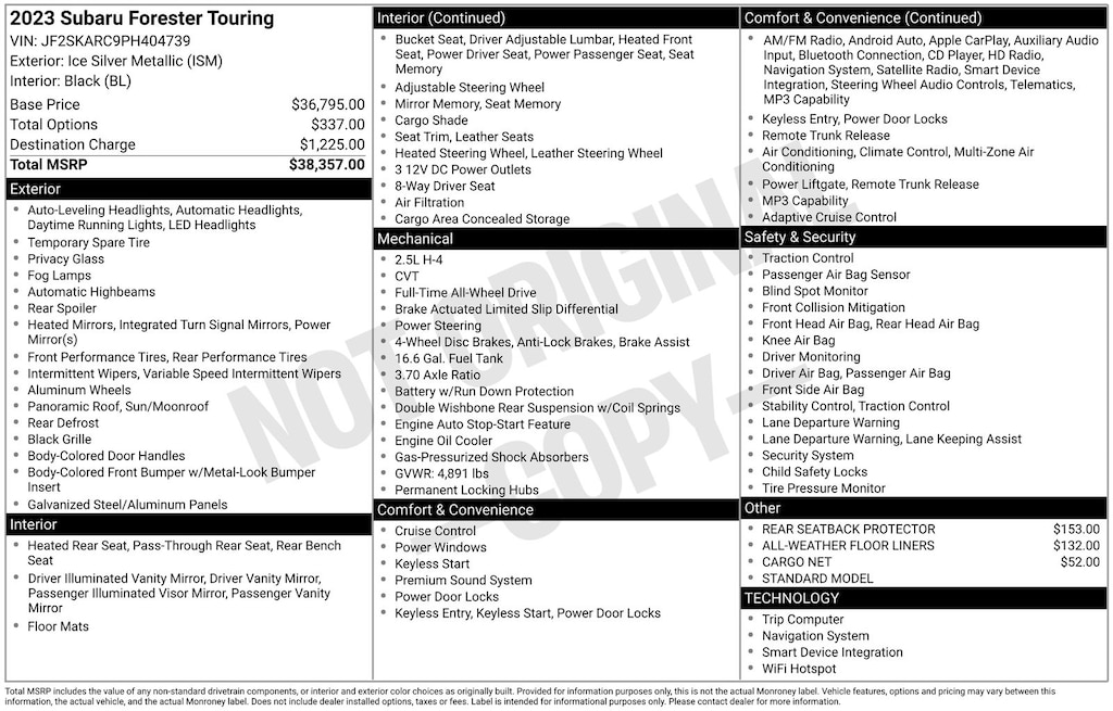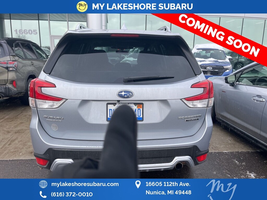 Forester Touring, Ice Silver Metallic, *ALL WHEEL DRIVE*, *APPLE CARPLAY & ANDROID AUTO*, *BLIND SPOT MONITORING*, *EYESIGHT Driver Assist*, *HEATED REAR Seats*, *HEATED STEERING WHEEL*, *LANE DEPARTURE WARNING*, *LEATHER HEATED POWER SEATS*, *LOCAL TRADE*, *OIL CHANGES for LIFE*, *PANORAMIC MOONROOF*. Certified. Ice Silver Metallic 2023 Subaru Forester Touring AWD Lineartronic CVT 2.5L 4-Cylinder DOHC 16V