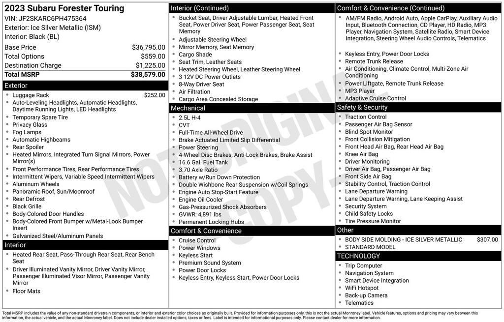 Forester Touring, Ice Silver Metallic, *ALL WHEEL DRIVE*, *APPLE CARPLAY & ANDROID AUTO*, *BACKUP CAMERA*, *BLIND SPOT ALERT*, *EYESIGHT Driver Assist*, *HEATED REAR Seats*, *HEATED STEERING WHEEL*, *LANE DEPARTURE WARNING*, *LEATHER HEATED POWER SEATS*, *LOCAL TRADE*, *OIL CHANGES for LIFE*, *PANORAMIC MOONROOF*, *PREMIUM SOUND*. Certified. Ice Silver Metallic 2023 Subaru Forester Touring AWD Lineartronic CVT 2.5L 4-Cylinder DOHC 16V