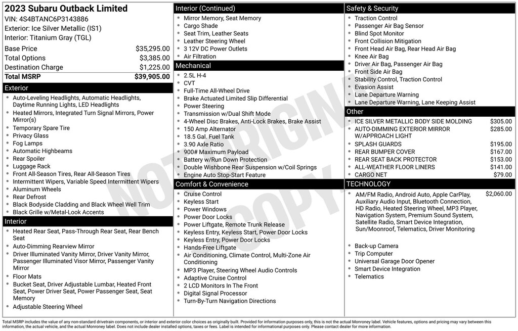 Outback Limited, Ice Silver Metallic, *ALL WHEEL DRIVE*, *APPLE CARPLAY & ANDROID AUTO*, *BLIND SPOT ALERT*, *EYESIGHT Driver Assist*, *HEATED REAR Seats*, *HEATED STEERING WHEEL*, *LANE DEPARTURE WARNING*, *LEATHER HEATED POWER SEATS*, *MOONROOF*, *OIL CHANGES for LIFE*, DriverFocus (Driver Monitoring System), Heated Steering Wheel, Power Moonroof, Power Moonroof & HSW & Navigation System, Radio: Subaru STARLINK 11.6" Multimedia Nav System. Certified. Ice Silver Metallic 2023 Subaru Outback Limited AWD CVT Lineartronic 2.5L 4-Cylinder DOHC 16V