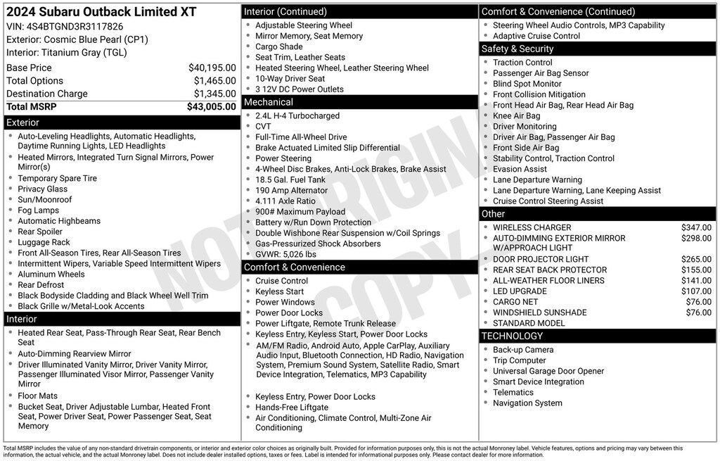 Outback Limited XT, Cosmic Blue Pearl, *ALL WHEEL DRIVE*, *APPLE CARPLAY & ANDROID AUTO*, *EYESIGHT Driver Assist*, *LANE DEPARTURE WARNING*, *LEATHER HEATED POWER SEATS*, *MOONROOF*, *OIL CHANGES for LIFE*. Certified. Cosmic Blue Pearl 2024 Subaru Outback Limited XT AWD CVT Lineartronic 2.4L DOHC