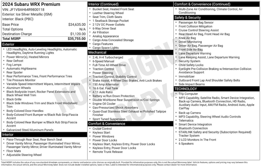 WRX Premium, Ice Silver Metallic, *ALL WHEEL DRIVE*, *APPLE CARPLAY & ANDROID AUTO*, *BACKUP CAMERA*, *EYESIGHT Driver Assist*, *HEATED SEATS*, *LANE DEPARTURE WARNING*, *LOCAL TRADE*, *OIL CHANGES for LIFE*, Standard Model (6MT). Ice Silver Metallic 2024 Subaru WRX Premium AWD 6-Speed Manual 2.4L DOHC