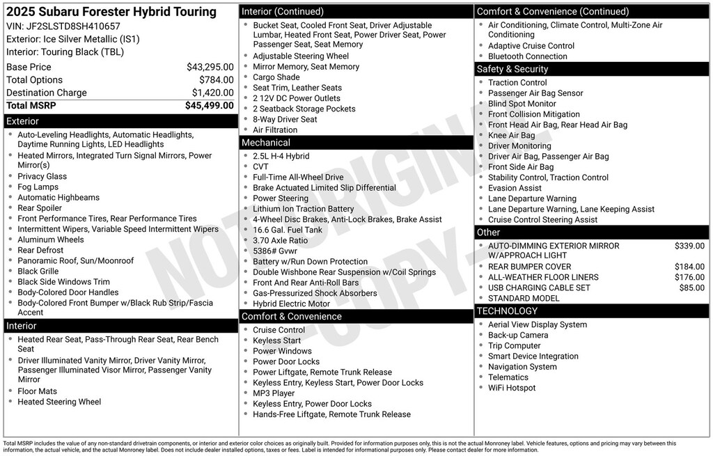 Forester Hybrid Touring, 2.5L 4-Cylinder DOHC 16V, Ice Silver Metallic, *ALL WHEEL DRIVE*, *APPLE CARPLAY & ANDROID AUTO*, *BACKUP CAMERA*, *BLIND SPOT ALERT*, *BLIND SPOT MONITORING*, *EYESIGHT Driver Assist*, *HEATED STEERING WHEEL*, *LANE DEPARTURE WARNING*, *LEATHER HEATED POWER SEATS*, *OIL CHANGES for LIFE*, *PANORAMIC MOONROOF*, *PREMIUM SOUND*. Ice Silver Metallic 2025 Subaru Forester Hybrid Touring AWD Lineartronic CVT 2.5L 4-Cylinder DOHC 16V