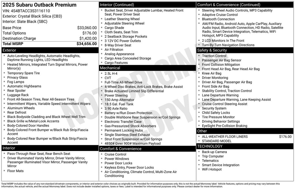 Crystal Black Silica 2025 Subaru Outback Premium AWD CVT Lineartronic 2.5L 4-Cylinder DOHC 16V