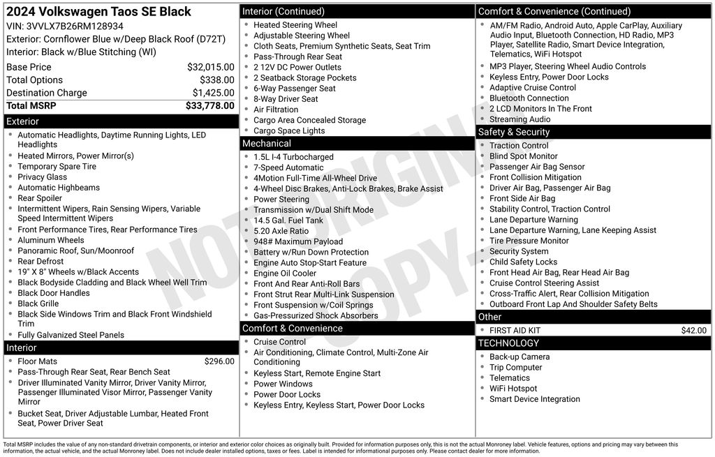 This 2024 Volkswagen Taos 1.5T SE Black is a true standout in its class. With its sleek exterior in a striking Blue hue and a well-appointed interior, this Taos is ready to elevate your driving experience. Under the hood, you'll find a potent 1.5L I4 Turbocharged engine paired with a 7-Speed DSG Automatic transmission, delivering an impressive 158 horsepower and an exceptional 24 city / 32 highway MPG.